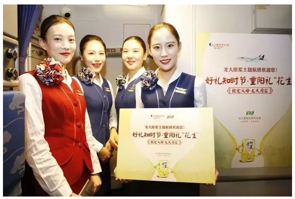 2018年10月17日,即農歷九月初九,在SC4698西安—青島的航班上,龍大糧油攜手山東航空打造了一場共賀重陽的“好禮知時節(jié) 重陽禮‘花生’”主題航班,精心為消費者準備了一份“油”愛的禮物,讓人們帶著愛回家。