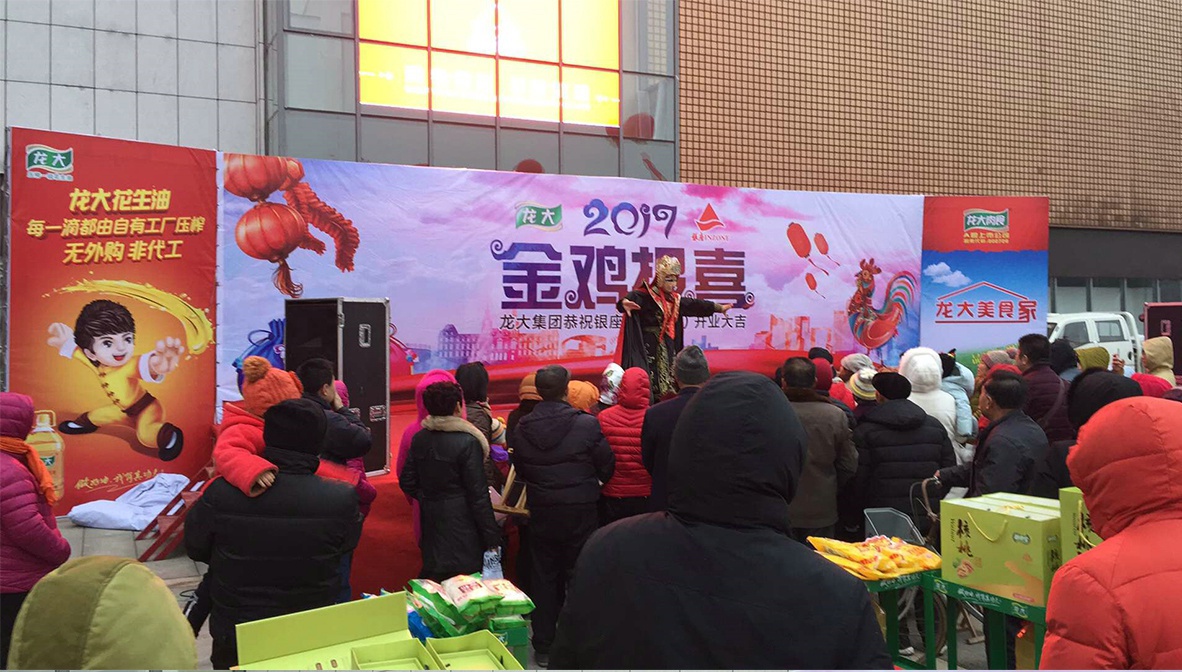 1月7日—9日,銀座萊陽店門前廣場喜氣洋洋。龍大集團組織旗下植物油、肉食品兩大內貿產品進行為期3天的路演,為銀座萊陽店開業助力。